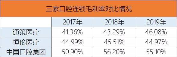 从毛利率角度看,口腔专科医院/诊所平均值在45%以上,行业毛利率前三名分别是中国口腔医疗、小白兔、华齿口腔,对应2019年毛利率分别为54%、53%、51%,大部分企业都在40%以上,差异较小。