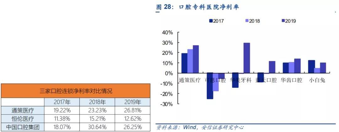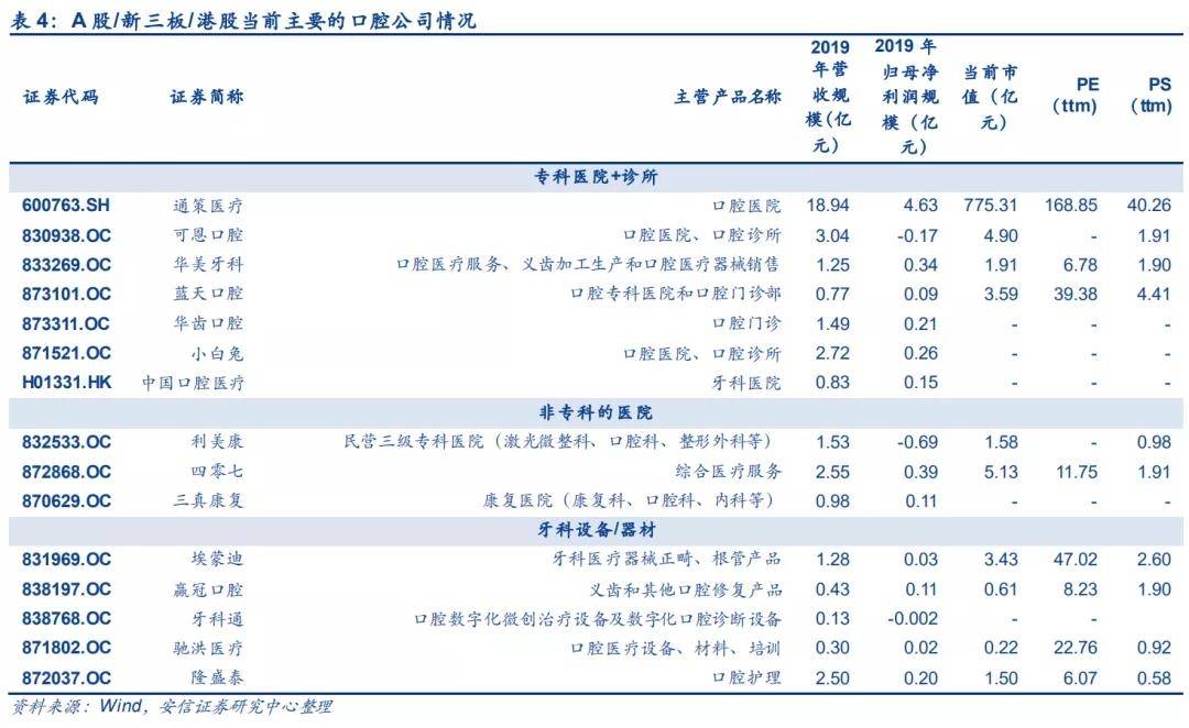 安信证券梳理了目前登陆资本市场的各家口腔服务机构的数据,可以发现大部分参与企业规模较小,且盈利能力参差不齐,并没有我们想象的暴利。