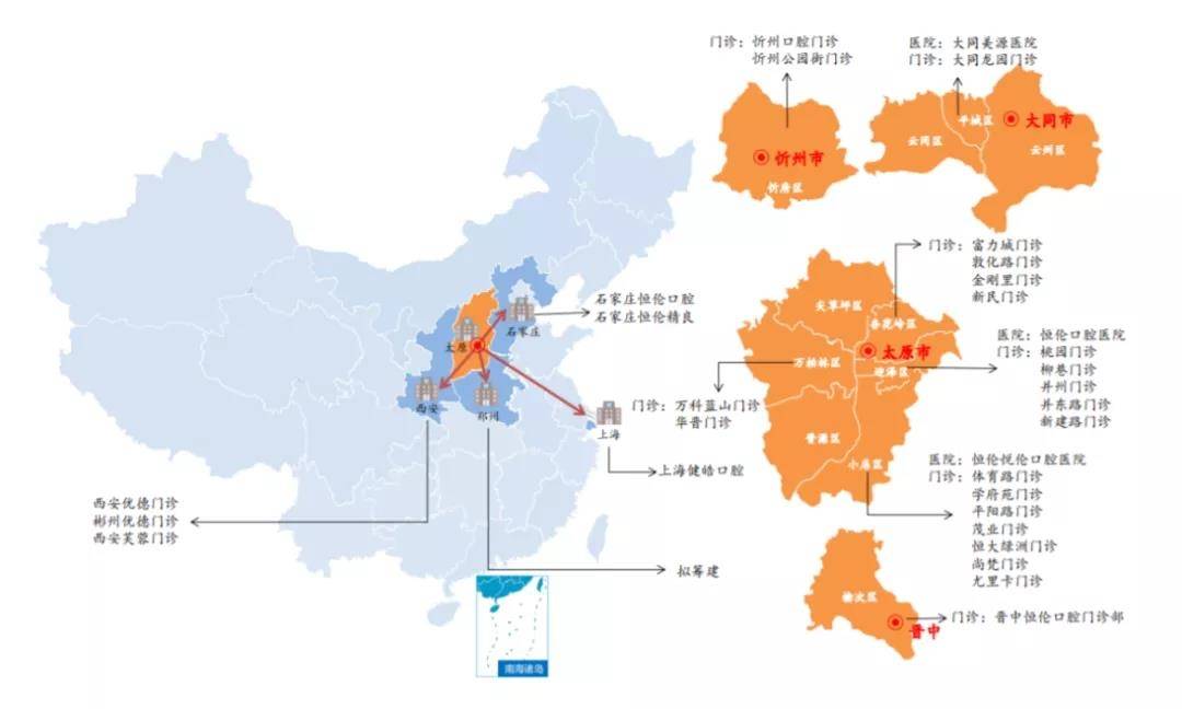 恒伦医疗:恒伦在山西省内已形成了“中心医院/旗舰门诊+连锁门诊”的业务发展模式,以城市或重点区域设立中心医院或旗舰口腔门诊,以城市社区为单位设立连锁经营门诊部,形成中心辐射型完整的口腔医疗服务覆盖体系。