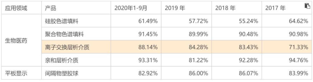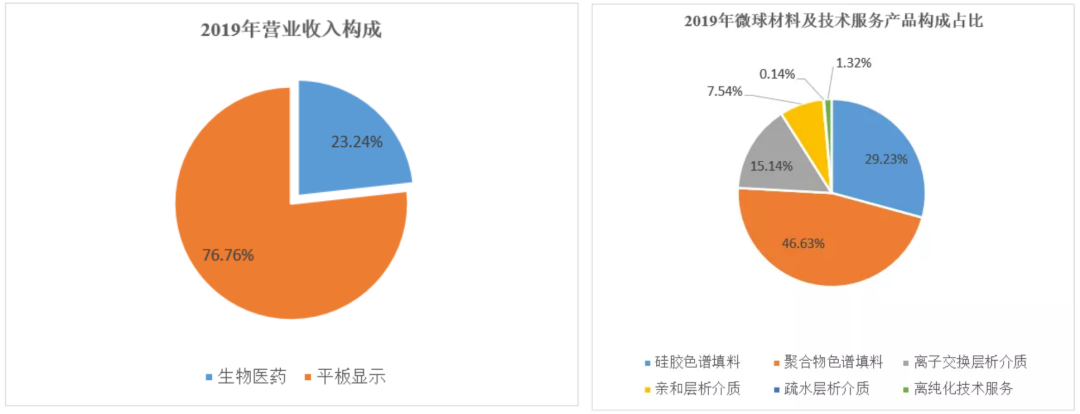 从纳微科技2019年的营收构成来看,公司大头收入源于生物医药领域,营收占比为76.76%,而其平板显示业务占比仅为23.24%。其中,生物医药领域收入又分为硅胶色谱填料、聚合物色谱填料、离子交换层析介质、亲和层析介质、疏水层析介质、药物分离纯化技术服务,显然色谱填料和分离介质这一类分离提纯材料是公司核心收入,并且公司生物医药领域收入占主营比例在逐年上升(65.48%→81.53%)。