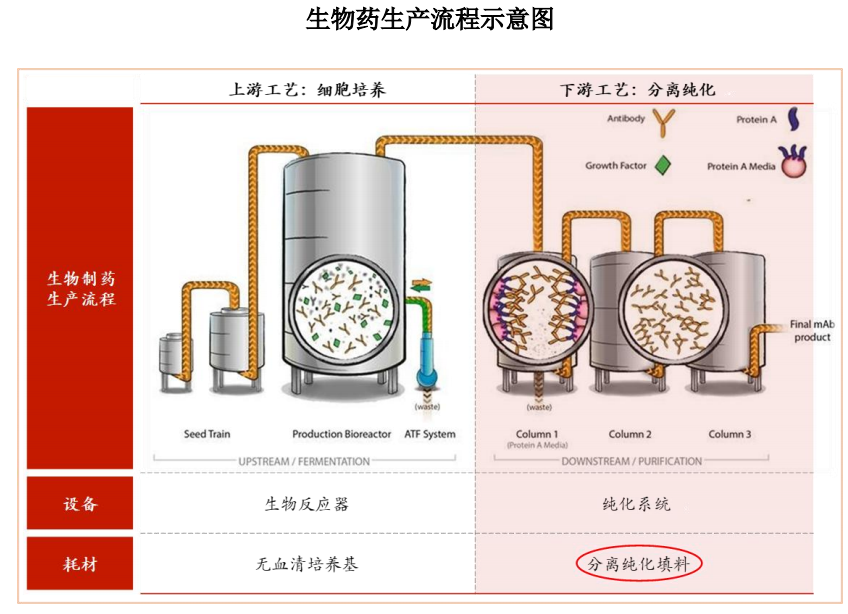 分离纯化是单克隆抗体、融合蛋白、疫苗、胰岛素、多肽等生物药的核心生产环节,直接决定了药品的纯度和质量,也是主要生产成本所在:以单抗生产为例,下游分离纯化环节占据了整个生产成本的65%以上,而色谱填料/层析介质微球是分离纯化环节的核心材料。