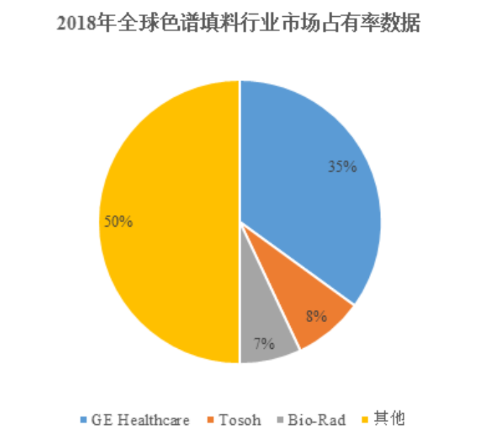 全球色谱填料大半的份额也基本由大型厂商供应,市场份额前三名分别为美国GE Healthcare、日本Tosoh、美国Bio-Rad,市占率对应35%、8%和7%。