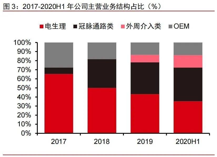 从惠泰医疗的收营收结构看,电生理与冠脉通路类产品是收入的主要来源,2019 年公司主营业务收入中电生理、冠脉通路类、外周介入类、OEM分别占比43.12%、35.01%、8.21%、13.66%。随着外周介入产品陆续上市销售放量,有望迅速提升所占营收比重,成为公司新的业绩增长点。