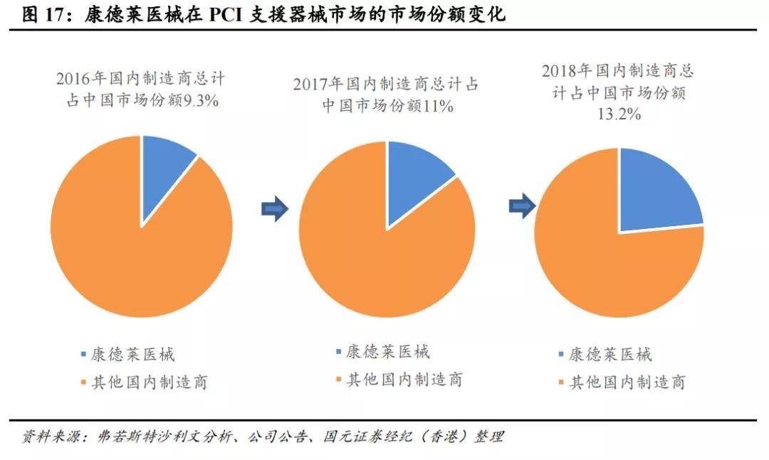 分析惠泰医疗冠脉通路器械业绩增长迅速的原因,大概率是源于市场份额的迅速提升,PCI手术增长起到助推作用。目前来看国产其他两家占有率有一定份量的玩家,麦瑞通未上市,同样康德莱医械今年的分部业绩也许能受到国产替代趋势的带动,可以看到公司2016-2018年在国产PCI支援器械市场份额在不断提升,但基于公司业务较杂,可能带来的弹性有限。