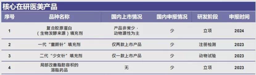这意味着,同时拥有肉毒素与玻尿酸的厂商竞争优势更大,就以目前国内各厂商两个品种的研发进度而言,四环医药是唯一一个同时拥有已获批上市的肉毒素产品和玻尿酸产品的上市公司。