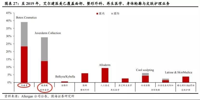 2019年,肉毒素与玻尿酸贡献艾尔建医美业务70%营收,其余医美业务占收入比重合计3成。