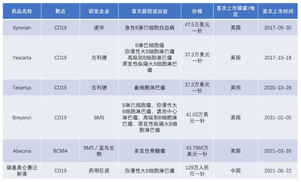 目前全球已经有6款CAR-T疗法被获批上市,除了BMS/蓝鸟靶向BCMA的Abecma,其余5款获批产品均靶向CD19。
