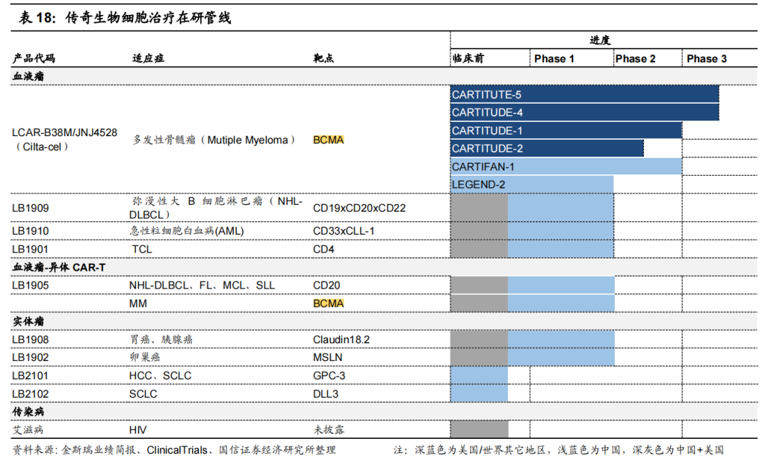 依托自有特色的技术平台,传奇生物开发出了丰富的自研管线。