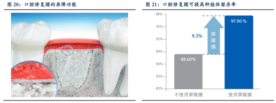 口腔修复膜可作为理想屏障,使骨量更多,骨质更好,提高种植体留存率。生理性骨吸收、骨组织不同程度缺损等情况会对牙种植手术效果产生较大影响,部分患者的压槽嵴会出现过窄或过低,发生局部凹陷,种植体侧方造成穿孔,进一步会导致牙种植手术发生失败。通过口腔修复膜对骨缺损部分进行覆盖后,可形成一层屏障从而得到封闭效果,缓解覆盖组织的压力,并对血凝块进行保护,形成良好的成骨空间,对影响骨形成的纤维细胞,结缔组织等进行阻挡,使具有成长潜力的的前体成骨细胞进入到骨缺损区,对缺损区的骨修复进行诱导再生,从而增加牙种植修复的成功率。