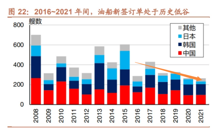 第二,散货船和油船当前的手持订单占运力的比重只有6%左右,处于历史低位。上一轮集装箱船的最低的位点,集装箱船在2020年9月份的时候到达了手持订单占用率比重最低的9%,现在散货船和油船比当时集装箱船最低的位点还要低。