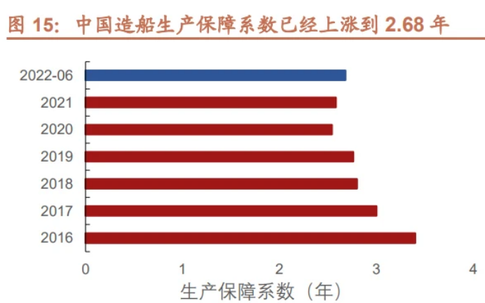 首先新签订单和完工订单本质上反映了一个时点船厂景气度状况,但是手持订单不仅反映了当前的状况,也同样反映了过去前两到三年之内的船厂接单的状况,所以这个是更能够反映中期视角船厂的业绩情况,由手持订单量派生了一个关键数据:造船生产保障系数。造船生产保障系数,这个系数的意思保有现在的手持订单船厂能够忙几年。造船生产保障系数一般2~2.5年,数值越大越景气,现在中国造船生产保障系数已经上涨到2.68年。中船反馈当前的保障系数已经达到3.5。