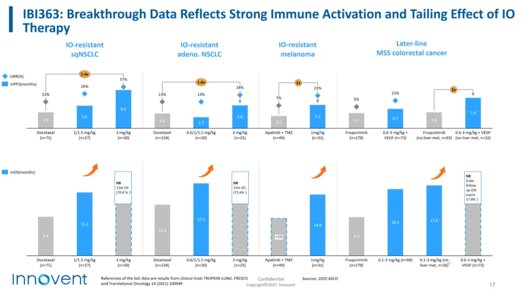 如下图所示,在免疫耐药肺癌、冷肿瘤免疫耐药黑色素瘤、冷肿瘤结直肠癌这三个经典癌种上,IBI363都展现出突破性获益优势,客观缓解率(ORR)、无进展生存期(PFS)实现倍数提升,更关键的是总生存期(OS)获益趋势也全面胜出。