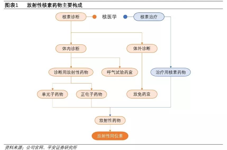 核素药物(简称核药)是指含有放射性同位素、用于医学诊断和治疗的一类特殊药物,其在临床上的应用主要包括:体内诊断(放射性核素诊断及诊断用药盒)、体内治疗(放射性核素治疗)和体外分析(放射性免疫分析等)。核素药物用于诊断的原理是利用特定的标记分子标记放射性同位素,引入体内后,标记分子会在靶标器官或组织聚集。通过在体外对同位素射线进行探测,获得靶标器官的影像或功能参数,进行动态观察或定量分析。核素药物用于治疗的原理是放射性同位素通过参与代谢过程或经标记分子引导,在病变组织聚集,在局部产生电离辐射对病变组织进行辐照,从而抑制或破坏病变组织。