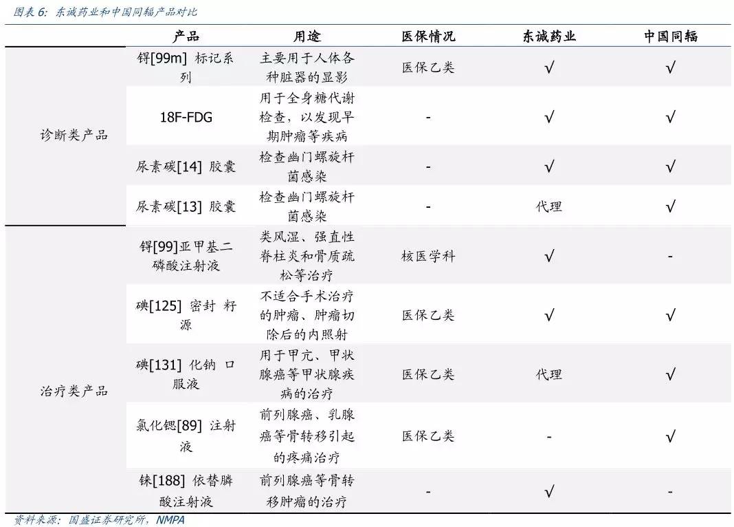 由于核素药物存在放射性,行业政策壁垒较高,目前生产放射性药物的企业仅有约 20 家,多数是过去各大同位素研究院下属事业单位改制而来,其中具备基础研发能力的单位或企业屈指可数。从研发管线来看,只有东诚药业和中国同辐的产品是最全的。目前东诚的产品管线中已形成包括云克注射液、锝标药物、正电子药物、I-125 密封籽源、C-14胶囊等主打产品,其他的包括 I-131 口服液、氯化锶等产品东诚也涉及有代理业务。