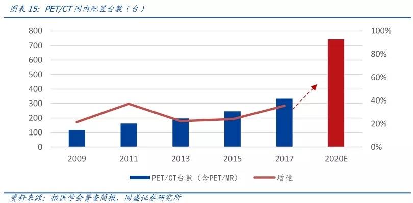 PET/CT台数翻倍,18F-FDG同步增长:2018 年 10 月,国家卫健委发布《2018—2020 年大型医用设备配置规划》,对 18-20 年 PET/CT 配置的数量做了明确规划,预计到2020 年 PET/CT 的台数将达到 710 台,在原 17 年的 343 台的基础上,增加 377 台。PET/CT 的数量的快速增加, 将驱动 18F-FDG 的市场销量。按照 19 年上半年的情况,总共有 78 台已经下放,按照规划未来的 1 年半时间内将有 299 台集中下放(占下放比例 80%,下放速度加快),我们认为也将进一步驱使 18F-FDG 快速放量,未来 18F-FDG 的增速有望维持在 30%以上,并且在PET/CT 数量增加后增速也有望维持。并且国内同发达国家相比 PET/CT 保有量严重不足,预计美国 3 亿人口对应 PET/CT 台数在 2000 台以上,保有量达到 6.7/百万人,而中国目前来看保有量仅有 0.2 左右,未来尚有很大的成长空间。