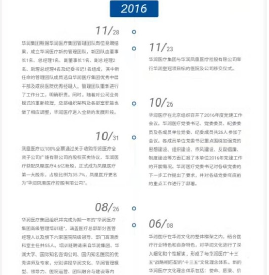 2016年10月,华润医疗完成了对于凤凰医疗的并购重组,并正式控股了华润凤凰医疗.从此,华润医疗正式进入了华润凤凰医疗时期.