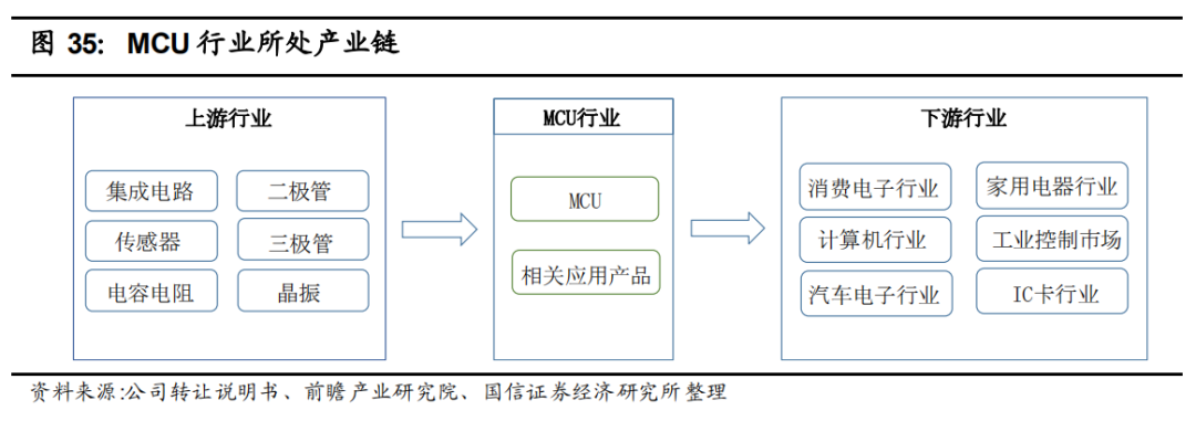 MCU发展到现在,产业链非常成熟。具体包括有上游半导体元器件,中游MCU集成,下游各行业应用。