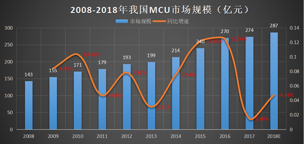 反观我国,MCU市场仍保持5.8%的增长速度,这时候市场规模已经为143亿元。