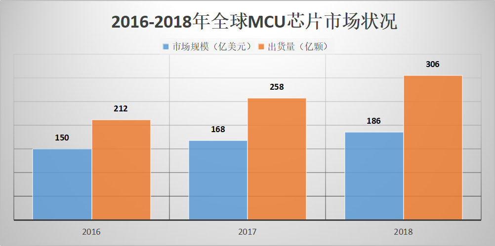 2018年,MCU全球销售额已经达到186亿美元,出货量为306亿颗。根据IC Insights的预测,2020年全球MCU芯片市场规模将达到207亿美元,出货量为361亿颗。