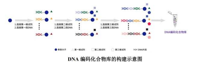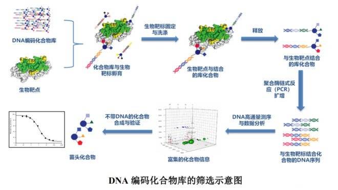首先将整个 DNA 编码化合物库(海量小分子)与生物靶点进行孵育,将生物靶点固定,通过化合物对生物靶点亲和力的强弱差异,将亲和力弱的化合物洗脱除去,亲和力强的目标化合物则会保留在生物靶点上,然后把目标化合物从生物靶点上解离释放,并将相应的 DNA 标签进行 PCR 扩增和 DNA 高通量测序与解码,通过 DNA 编码与化合物结构的对应关系,推断出富集的化合物结构信息,重新合成这些不带 DNA 标签的化合物,进行活性验证,从而得到苗头化合物。