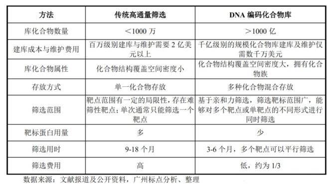传统的高通量药物筛选技术,由于效率相对较低,时间和资金投入极大(建立一个百万级别的高通量筛选化合物库,平均每合成一个化合物需要 80-100 美元,每进行一次筛选需要 0.5-1 美元,建设存放化合物库的设施需要上亿美元,每年维护化合物库的费用需要数千万美元)。新的 DNA 编码化合物库技术,缩短了技术平台建立时间,降低了筛选成本,研发成本与传统高通量筛选相比节省三分之二以上。