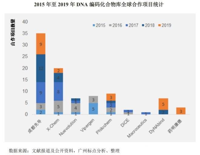 在对外服务的 DEL 技术领域研发服务公司中,成都先导处于优势地位。2015 至 2019 年已经公开的 DEL 技术合作项目中(各家企业部分未公开的合作项目未纳入统计),有超过 1/3 是成都先导进行的,2018 年更是占据了 DEL 技术合作公开项目中的 60%(12 项),从已公开的合作项目统计看(2015 年至 2019 年),成都先导是DEL 技术领域研发服务公司中获得合作项目最多的企业。
