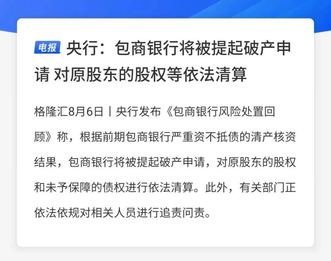 2020年8月6日,央行在二季度中国货币政策执行报告中,宣告包商银行将成为中国第三家破产倒闭的银行,“根据前期包商银行严重资不抵债的清产核资结果,包商银行将被提起破产申请,有关部门正依法依规对相关人员进行追责问责。