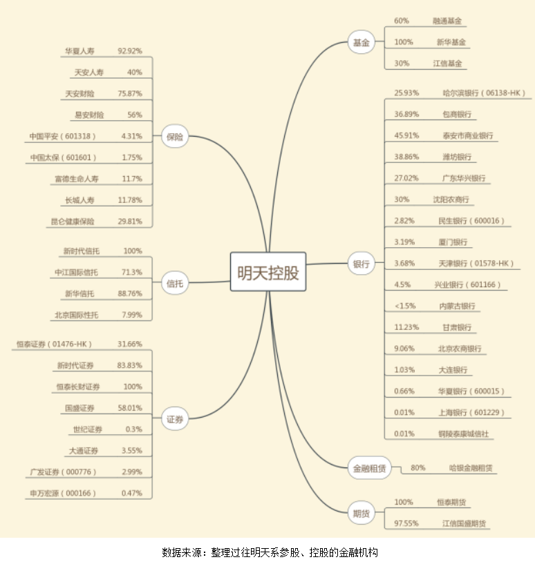 从一间城市银行开始,肖建华的明天系悄然倔起成一座金融帝国。盘子越铺越大,到2017年为止,旗下控参股有44家金融机构,包括哈尔滨银行、兴业银行、上海银行、天安人寿、生命人寿、新时代信托、广发证券等,涵盖证券、银行、保险、信托、期货、PE、基金等。