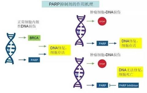 当PARP与BRCA同时存在缺陷时,恶性肿瘤细胞无法被修复,导致恶性肿瘤细胞死亡。因此,在BRCA突变的癌细胞中,凭借合成致死的机制,通过单用PARP抑制剂或联用化疗药物,可有效清除BRCA基因突变的乳腺癌、卵巢癌细胞。
