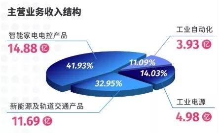 分板块来看,公司产品主要包括智能家电电控产品、工业电源、工业自动化和新能源汽车及轨道交通产品四大类。其中,智能家电电控产品的主要细分产品包括平板电视电源、变频家电功率转换器、智能卫浴整机及部件等;工业电源主要细分产品包括医疗设备电源、通信设备电源、工业导轨电源以及大功率 LED 显示电源等;工业自动化主要细分产品包括电机驱动器及伺服、可编程逻辑控制器(PLC)、 数字化焊机、工业微波设备、油服设备等;新能源汽车及轨道交通产品包括新能源汽车电力电子集成模块(PEU)、电机驱动器(MCU)、车载充电机(OBC)、DCDC 模块和充电桩模块、 轨道交通空调控制器等。