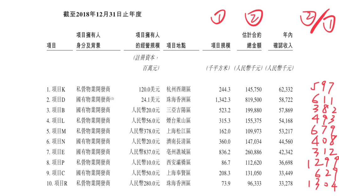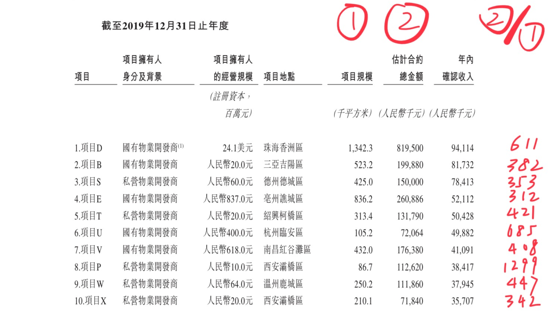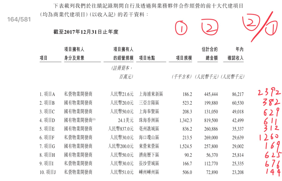 而商业代建,回报就比这个数字高多了。我翻出了招股书P156-P158页,其中罗列了二十多个商业代建项目的建筑面积与合约金额,我把两个数一除,就得到了商业代建的单位面积合同收入,结果显示各个项目差异较大,平均每平方400块左右: