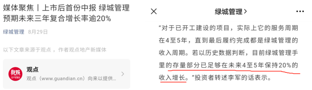 于是我四处找公司的指引,结果在公司官方的微信公众号上看到这样一篇文章,标题就点明“预期未来三年复合增长率逾20%”,正文里甚至还有一段“目前绿城管理手里的存量部分已足够在未来4-5年保持20%的收入增长”。