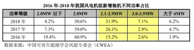2018 年,中国新增装机的风电机组平均功率 2.2MW,同比增长 3.4%;截至2018 年底,累计装机的风电机组平均功率为 1.7MW,同比增长 2.5%。新增风电机组中,2MW 以下(不含 2MW)新增装机容量市场占比达到 4.2%;2MW 风电机组装机占全国新增装机容量的 50.6%;2MW 至 3MW(不包括 3MW)新增装机占比达到 31.9%;3MW 至 4MW(不包括 4MW)机组新增装机占比达到 7.1%,4MW 及以上机组新增装机占比达到 6.2%