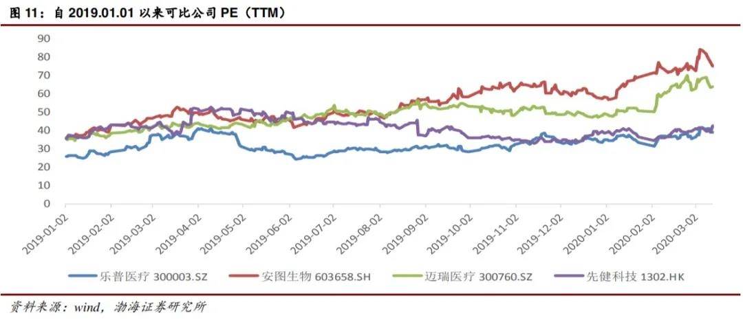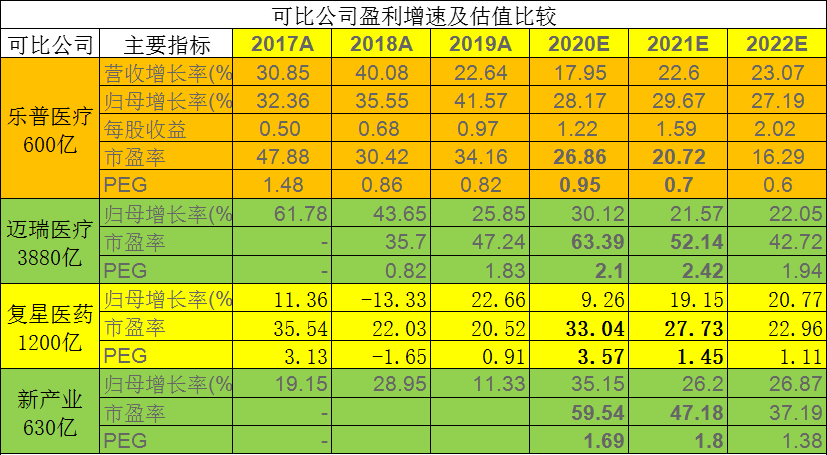 从可比公司比较来看,一是医疗器械龙头迈瑞医疗,未来三年归母净利润复合增速为24.5%,目前PE估值为63倍。二是同样具有药品、器械及医疗服务三大业务板块(药品占比76%)的平台型公司复星医药,未来三年归母净利润复合增速为16.3%,目前PE估值为33倍。三是以化学发光免疫诊断为主营,市值与乐普相当的新产业,未来三年归母净利润复合增速为29.3%,目前PE估值为60倍。四是同样以心血管器械为主营业务且市值相当的微创医疗,目前PE(TTM)估值预计为81倍。从可比公司比较看,公司目前的估值水平有比较大的优势。(价格为:9月18日,各公司收盘价)