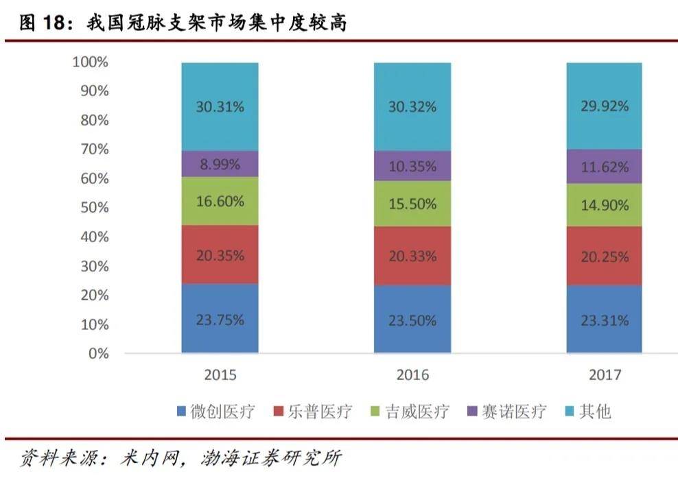 国产支架基本实现进口替代,国产率达80%以上,行业集中度较高,竞争格局较好,其中微创医疗、乐普、吉威医疗、赛诺医疗四家公司2017年市占率达到70%,乐普市占率20.25%,仅次于微创医疗(23.31%),公司2015 年来支架业务保持约20%的增势,有望凭借率先获批的第四代可降解支架进一步拓展市场份额。