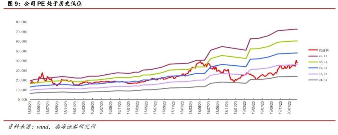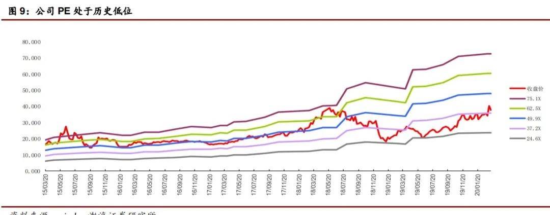 从公司历史估值来看,2019年1月公司最低PE估值为24.6倍,最高PE为75倍,PE估值中枢为50倍。公司目前28倍的估值接近历史最低位置。