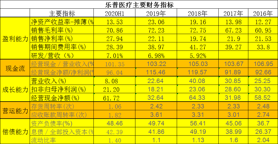 一是盈利能力很强。毛利率近几年稳步提升至70%以上,2019年净利率22%(微创医疗为3.66%),2020年上半年因为期间费用率下降十个百分点,导致净利率提升了近6个百分点。净资产收益率也是逐年提升至2019年的23%(一般来说,ROE水平能长期稳定保持在15%以上的企业,是值得长期投资的好公司)。