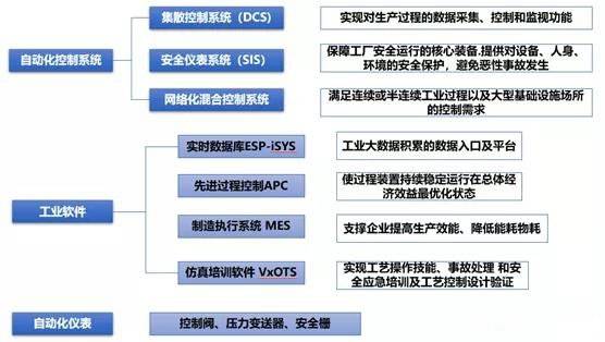 工业自动化分为自动化仪表(现场设备层)、控制系统(过程控制层)、工业软件(制造执行系统层)、企业综合管理信息系统(企业管理层)四大类。公司在工业企业产品生命周期维度上主要覆盖生产层级,涉及自动化仪表、控制系统、工业软件三大类,贯穿设备层、单元层、车间层三个层级,具体如下图:
