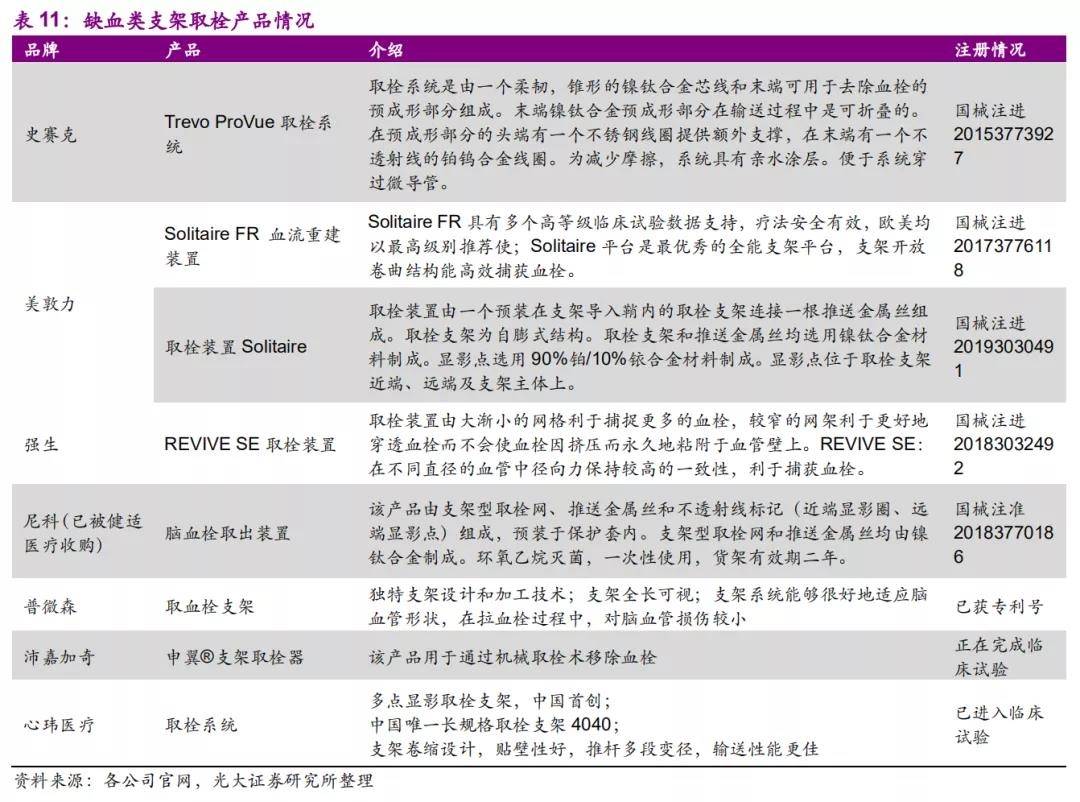 - 取栓支架:沛嘉的申翼®支架取栓器若能在下半年实现商业化,其将成为支架取栓器获批的国产厂商,前两家是江苏尼科和归创通桥。