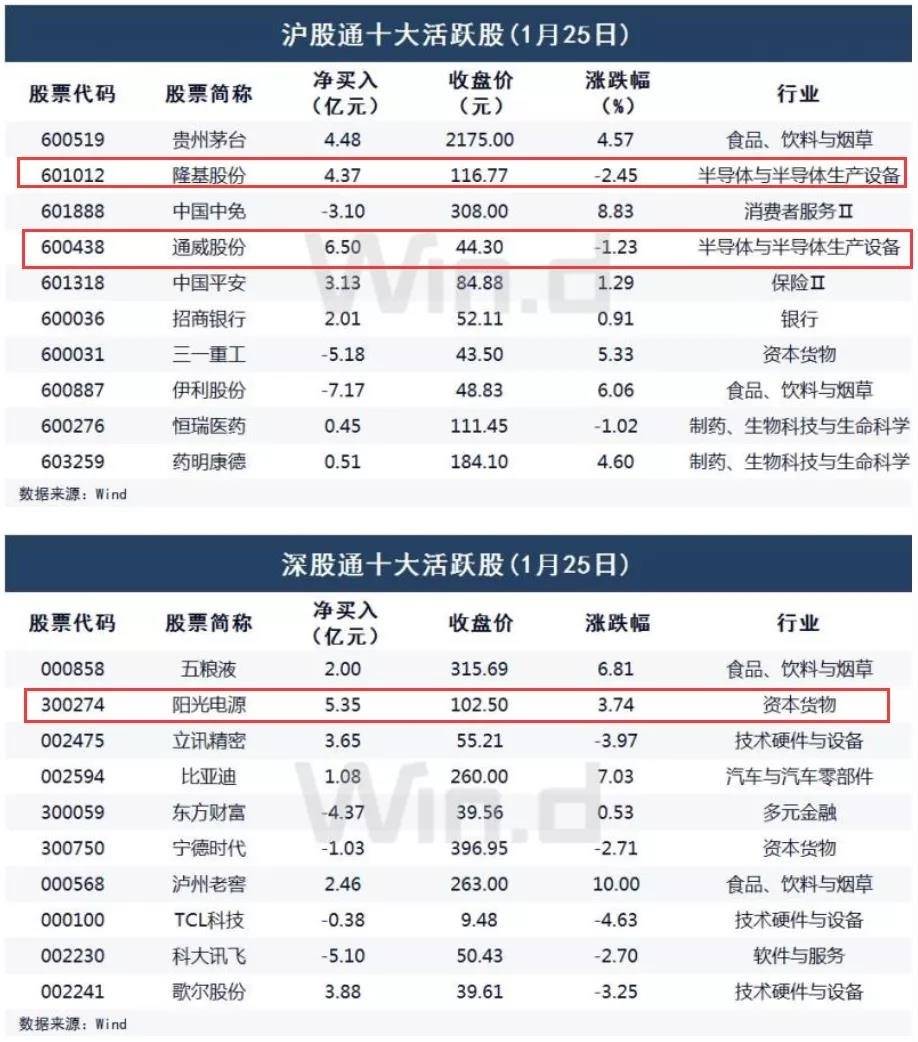 1月25日,北向资金净买入19.31亿元。其中,光伏股通威股份、阳光电源、隆基股份分别净买入6.5亿元、5.35亿元、4.37亿元。