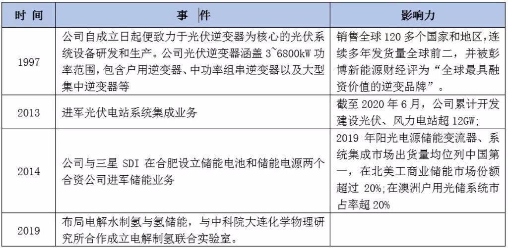 主要产品有光伏逆变器、风电变流器、储能系统、水面光伏系统、新能源汽车驱动系统、充电设备、智慧能源运维服务等。目前国内市占率30%左右,国外市占率15%左右,截至2020年6月,公司在全球市场累计逆变设备装机超120GW。