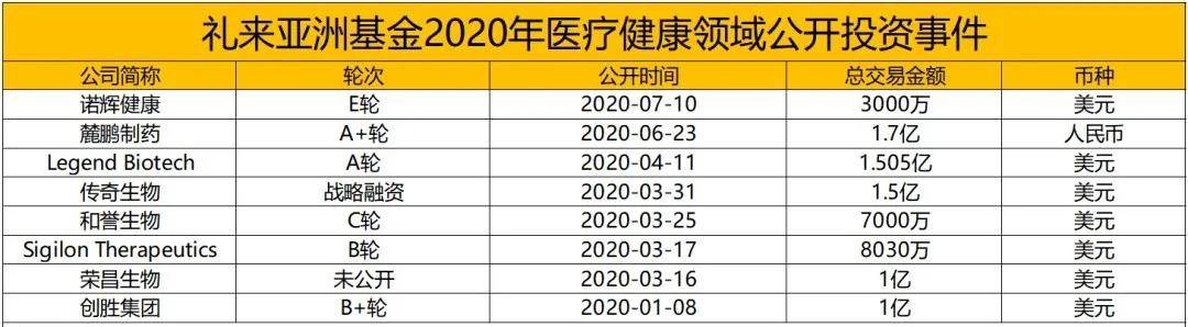 附礼来亚洲2020年最新投资动态(截止至2020年三季度)