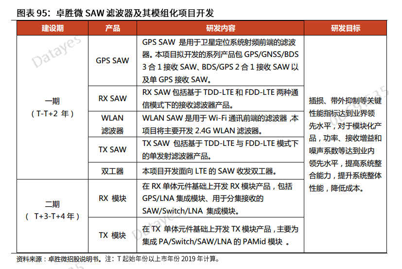 公司模组化研发难关重重,接收端及发射端模组研发中,滤波技术、射频功率放大器(PA)工艺和双工器的设计能力是重中之重,卓胜微2019年通过募投和定增布局全力攻克SAW和PA核心技术。(注:声学滤波器可分为 SAW 和 BAW。)