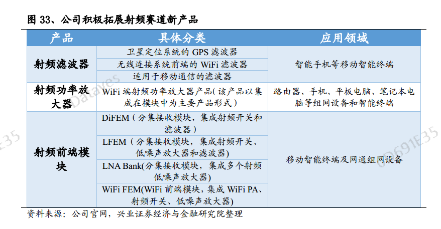 射频前端模块产品主要是接收端模块和WiFi前端模块,接收端模块包括DiFEM、 LFEM、 LNA Bank,是公司模块技术的重要里程碑,主要应用在手机端,WiFi FEM 模块目前主要应用在路由器领域。