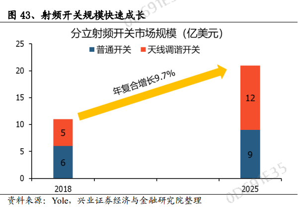 5G升级天线调谐广泛应用,单体射频开关量价齐升,射频开关市场规模增长迅速。对于射频开关来说,插入损耗越小、隔离度越高是体现开关优异性能的重要指标。