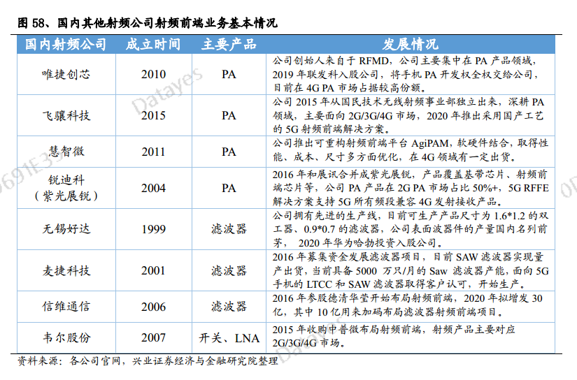 目前大部分国内射频公司射频产品只是面向2G/3G/4G市场,覆盖5G的射频产品不多。