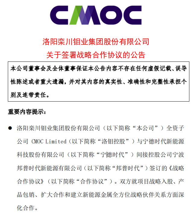 4月11日,洛阳钼业官方公告表示,双方已经签订《战略合作协议》。宁德时代通过间接控股公司邦普时代的子公司时代新能源以总对价1.375亿美元获得了洛阳钼业子公司洛钼控股的子公司香港KFM控股25%股权。