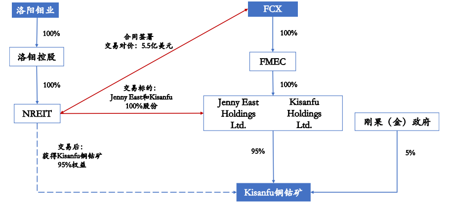 2020年年底,洛阳钼业通过洛钼控股全资设立的私人公司Natural Resource Elite Investment Limited从自由港处购买其间接持有Jenny East Holdings Ltd.和Kisanfu Holdings Ltd. 100%股份的交割,取得Phelps Dodge Congo S.A.R.L. 95%的股份,从而间接获得Kisanfu铜钴矿95%的权益(另外5%股权在政府手里)。