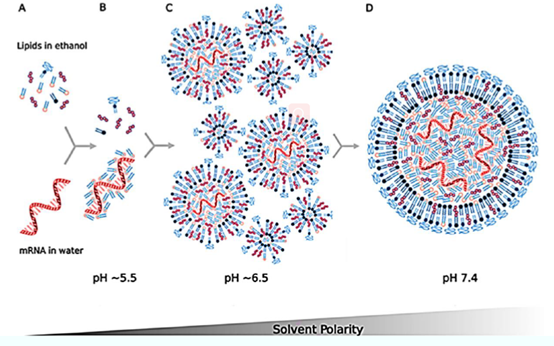 mRNA的制备在实验室和工业生产是比较类似的。LNP和mRNA的颗粒是通过自组装形成,通过两种液体按照合适的流速和配比形成。基本原理:T型管一端是RNA的水溶液,一端是脂质的乙醇溶液,通过两相的快速混合是溶液极性快速增加使脂质分子过饱和,从而让LNP完成自主装。需要控制水相和乙醇相的流速比,设计管道的形状。额外的气相流超滤替换溶液的PH值使LNP表面的阳离子脂质尽量不带电,并除掉乙醇,最后进行灌装。