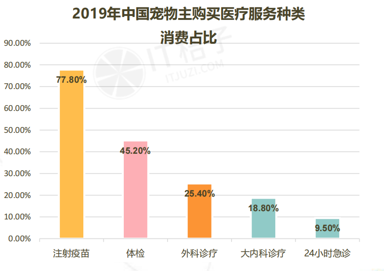 据对宠物主的调查结果显示,宠物医疗消费以疫苗、驱虫、绝育等需求为主,其中疫苗需求为刚需。宠物主购买宠物医疗服务的种类中,77.8%的人有选择疫苗消费;45.2%的人有选择体检消费。此外内科、外科诊疗分别占比25.4%、18.8%,有9.5%有过急诊服务消费。